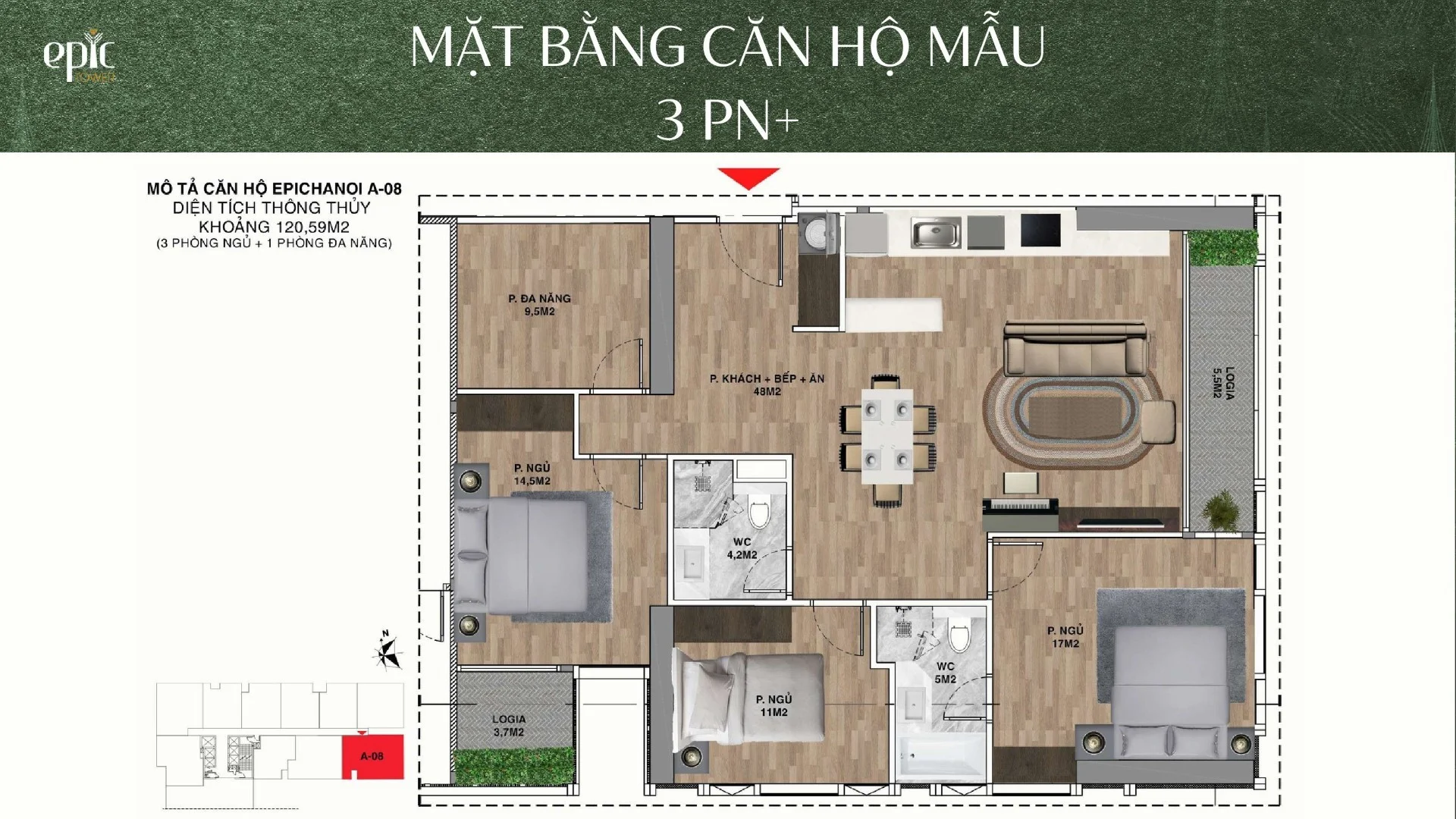 Thiết kế căn hộ 3 ngủ+1 mẫu A08 Epic Tower