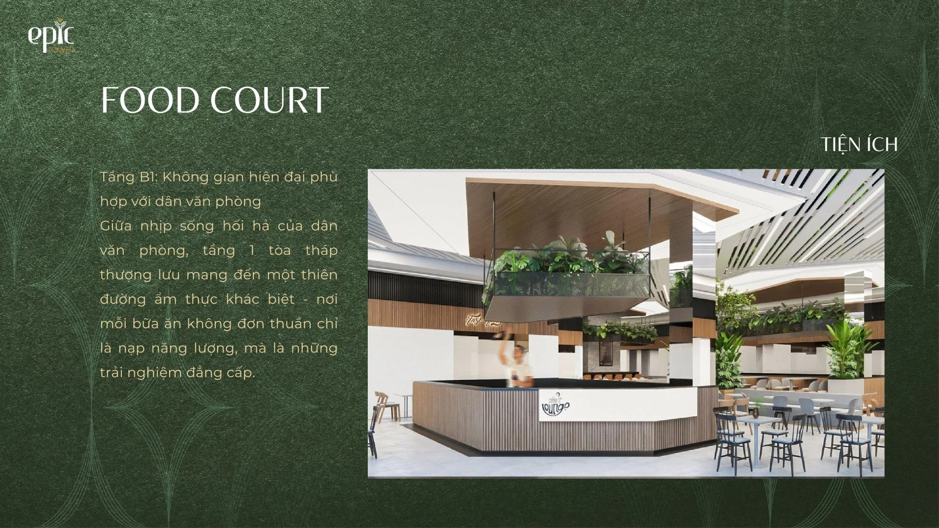 Food Court nằm tại tầng 1 của Epic Tower mang tới thiên đường ẩm thực cho cư dân cũng như khách hàng.