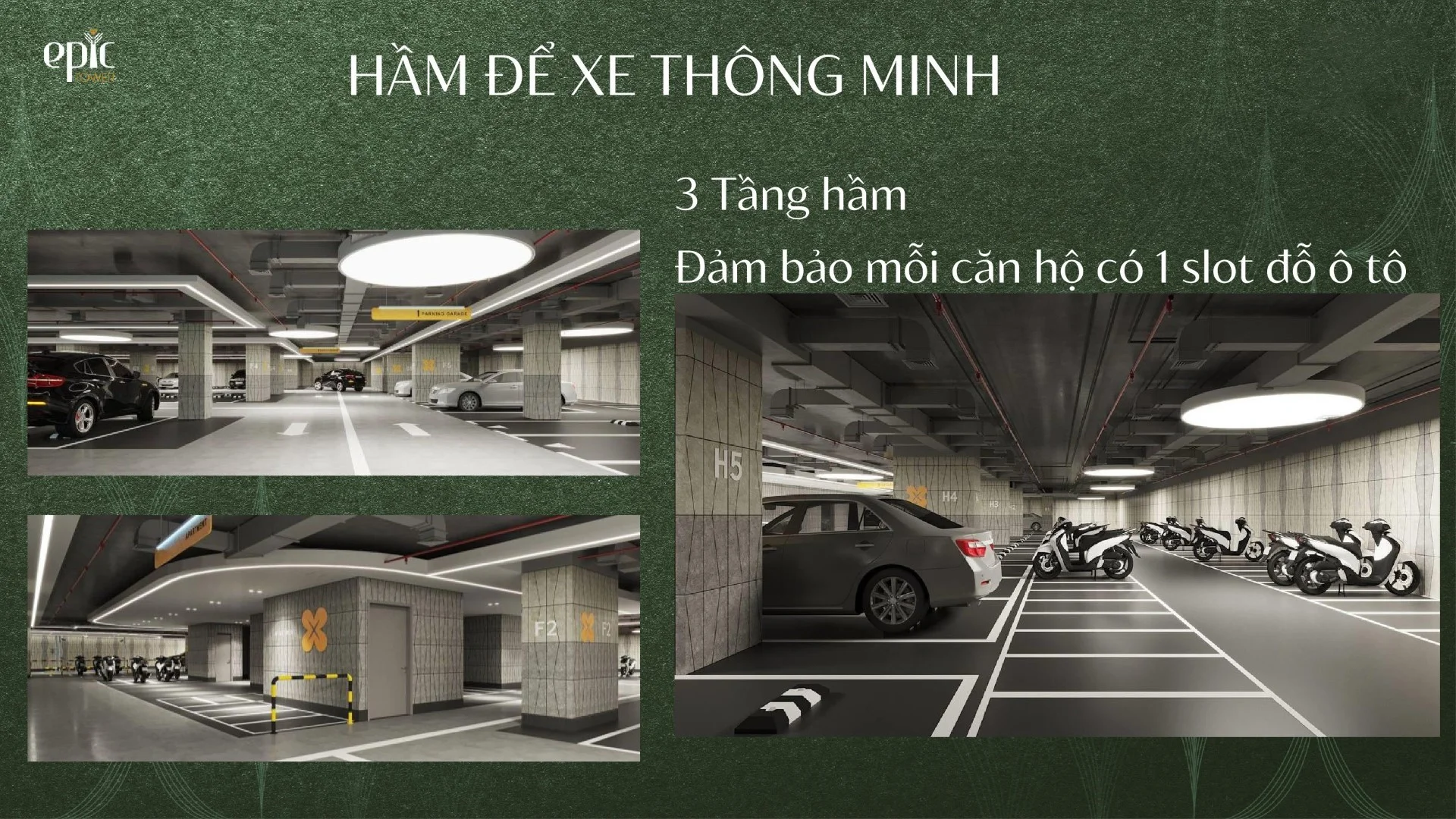 Tầng hầm tại Epic Tower có sức chứa khoảng 500 xe hơi và 3000 xe máy, chiều cao tới 4,8m có thể làm bãi xe thông minh