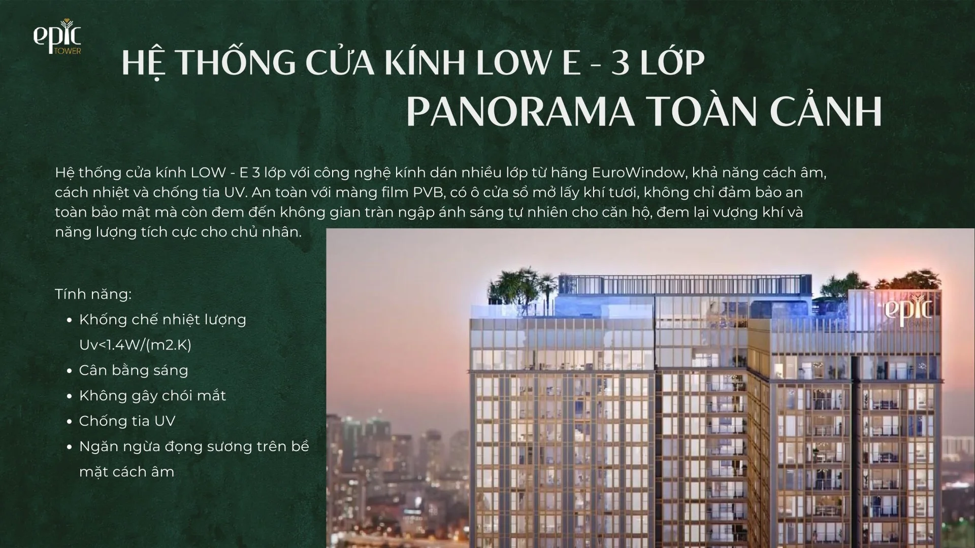Hệ thống cửa kính tại Epic Tower là kính Low-E 3 lớp cao cấp từ Eurowindow giúp cách âm cách nhiệt hiệu quả.