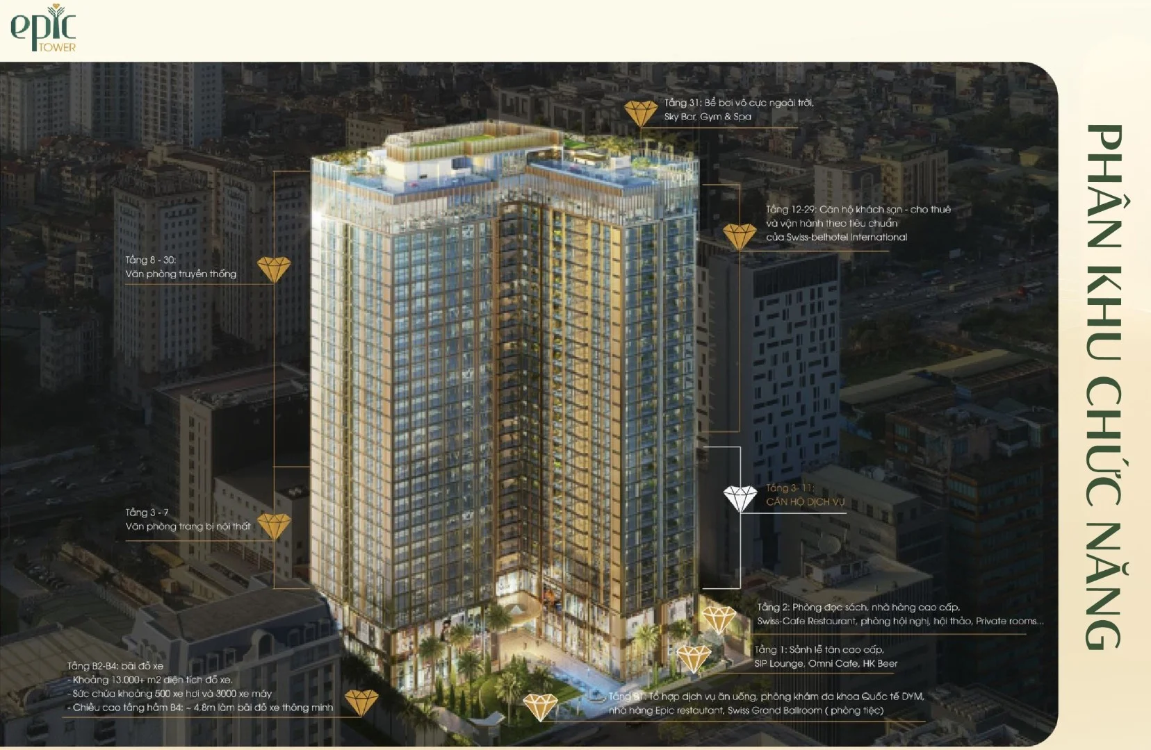 Swiss-Belhotel International là đơn vị quản lý khách sạn 5 sao tại hơn 20 quốc gia, vận hành hơn 135 khách sạn, khu nghỉ dưỡng và dự án danh giá trải dài từ Australia, New Zealand, Trung Quốc, Indonesia, đến United Arab Emirates, Bahrain, Dubai, Ai Cập,... Với vị trí đắc địa của Epic Tower, được ví như "Thung lũng Silicon" của Hà Nội, ngay sát Đại sứ quán Hoa Kỳ, nơi có cơ sở hạ tầng và dân trí thuộc top đầu,...đã khiến Swiss-Belhotel International lựa chọn hợp tác để biến nơi đây thành toà tháp biểu tượng của sự kết nối, mang đến môi trường sống đẳng cấp cho các chuyên gia và doanh nhân thành đạt.