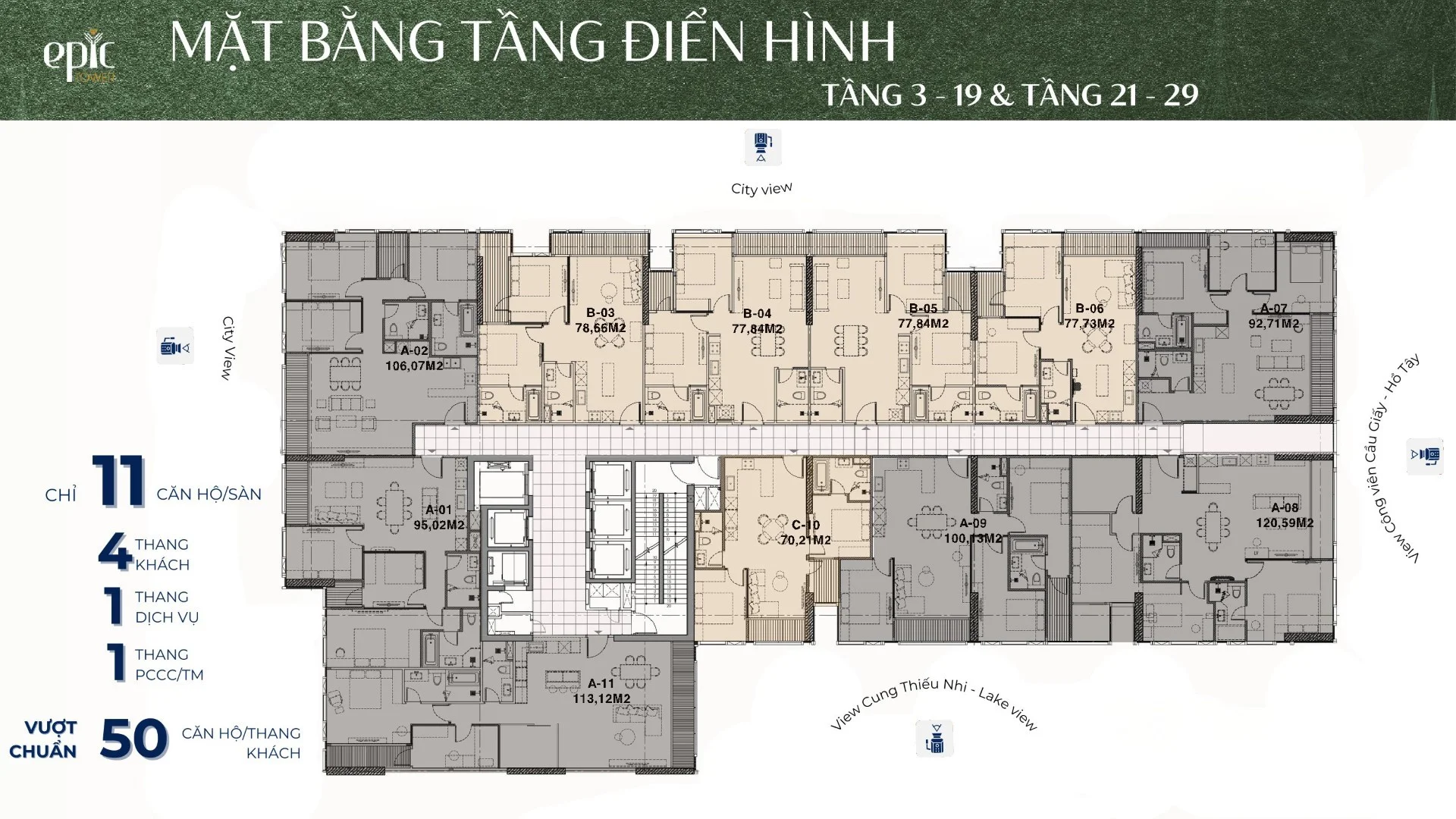 Khu căn hộ Epic Tower có thiết kế 30 tầng và 4 tầng hầm, mỗi tầng có 11 căn hộ trên một mặt sàn, 5 thang máy tốc độ cao với 5 căn hộ 2 phòng ngủ và 6 căn hộ 3 phòng ngủ diện tích từ diện tích 68,5m² – 121m², khi hoàn tất cung cấp ra thị trường 308 căn hộ hạng sang.