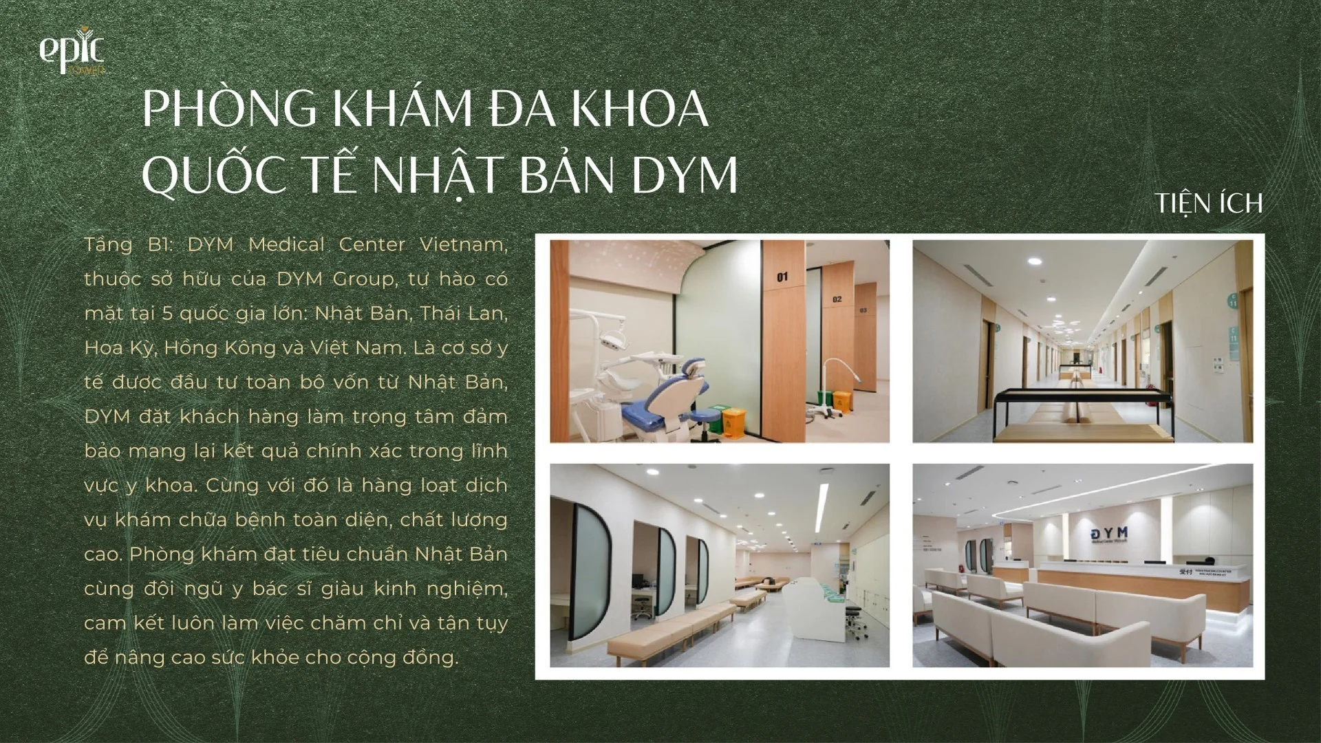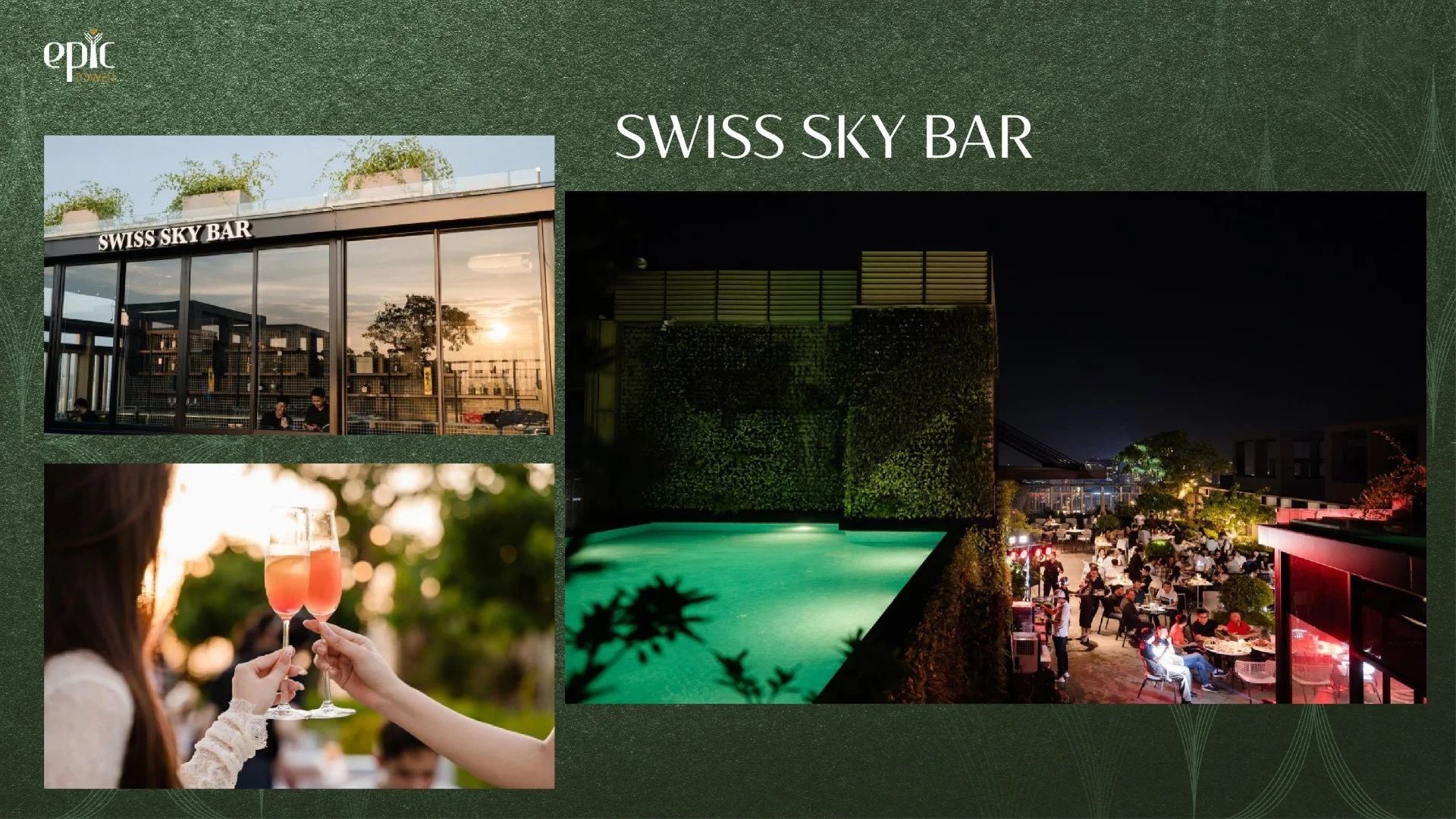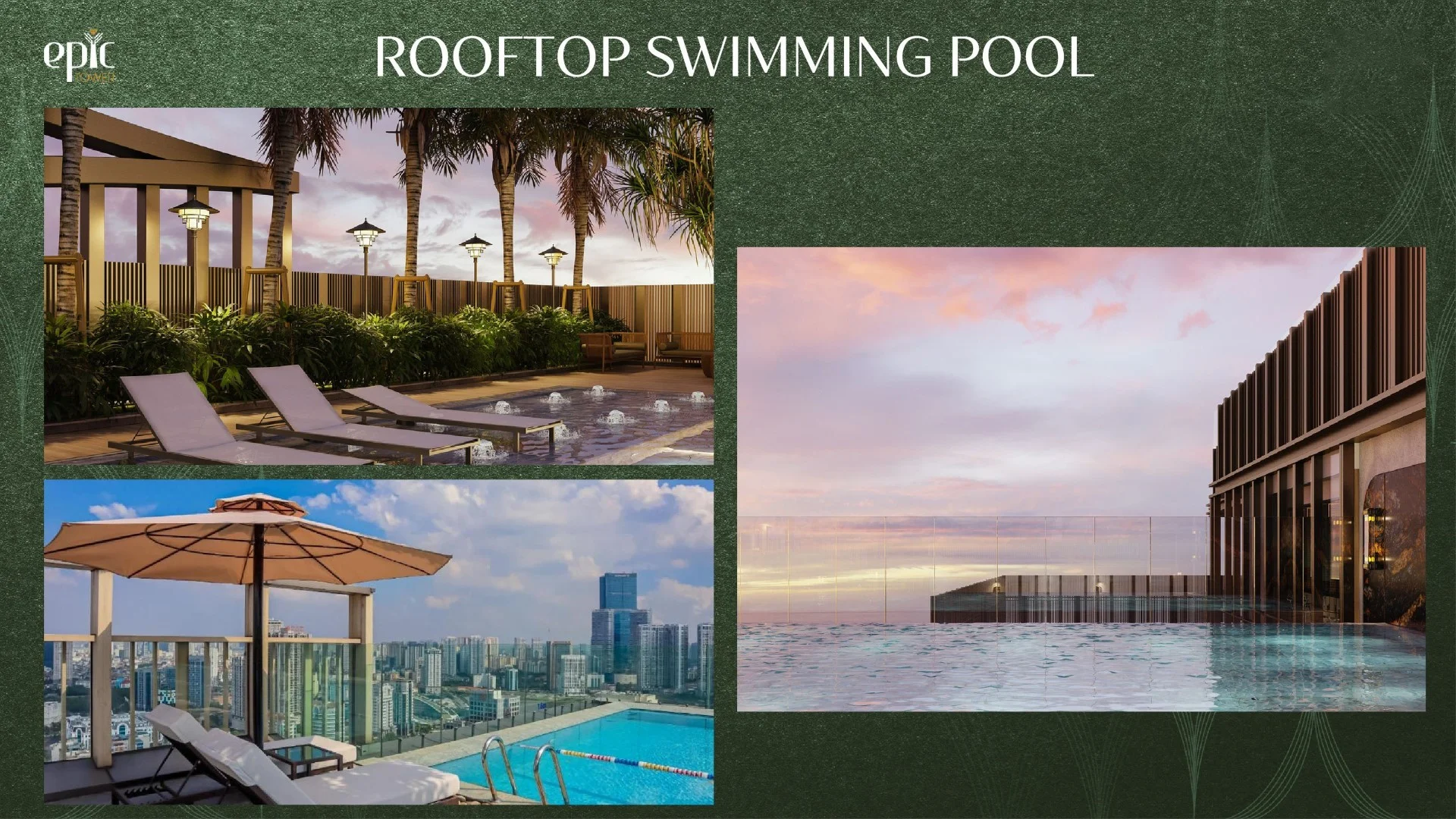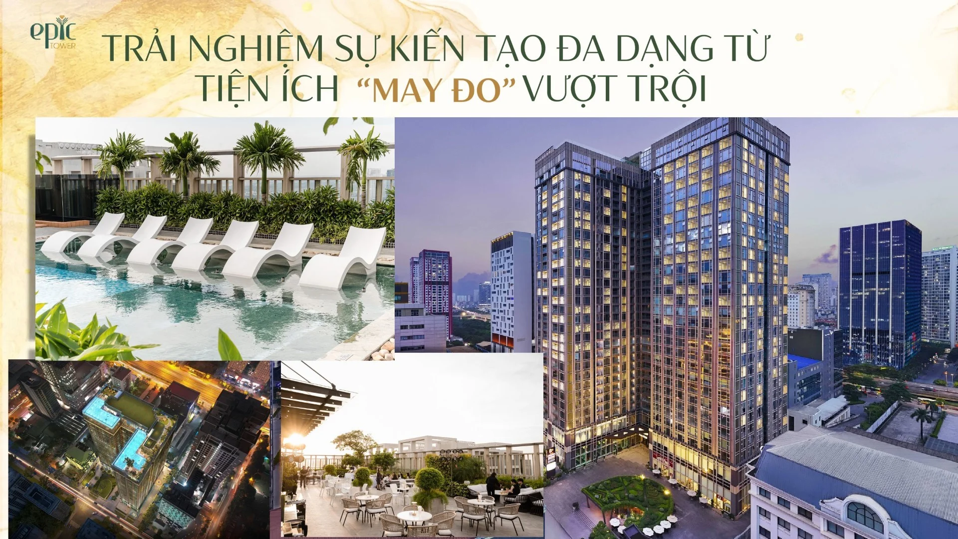 Epic Tower mang đến chuỗi hệ thống tiện ích nội khu cá nhân hoá theo từng khách hàng với Swiss-Fitness Center hiện đại, khu Spa, Sky Bar trên tầng 31 với tầm view toàn cảnh, nhà hàng Swiss-Café Restaurant sang trọng, SIP Lounge đẳng cấp, cùng phòng khám đa khoa quốc tế Nhật Bản DYM Medical…Ngoài ra Epic Tower còn sở hữu bể bơi vô cực ngoài trời trên tầng mái độc đáo mà hiếm dự án nào có được.