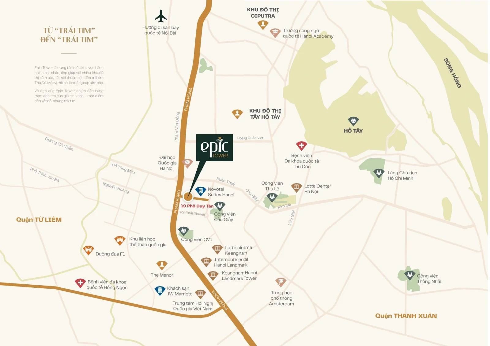 Xung quanh dự án Epic Tower là hệ thống hạ tầng giao thông đã phát triển hiện đại với các trục đường huyết mạch như Phạm Hùng, Phạm Văn Đồng, Nam Từ Liêm, Cầu Giấy, Vành đai 3, đường 32… giúp kết nối dễ dàng tới các trung tâm hành chính phía Tây cũng như kết nối tới trung tâm phố cổ Hà Nội.